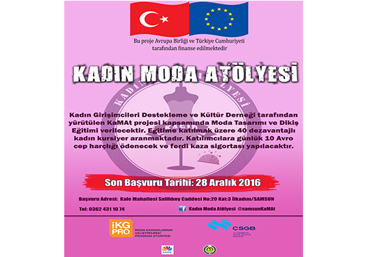 Kadın Moda Atölyesi projesi ile KAGİD, Samsun ilinde yaşayan 40 dezavantajlı kadının Moda Tasarımı ve Dikiş, Uygulamalı Girişimcilik, Toplumsal Cinsiyet Eşitliği ve Sosyal Girişimcilik ve Kooperatifçilik eğitimleri ile istihdam edilebilirliklerinin ve sosyal entegrasyonlarının artırılmasını hedeflemektedir. Bu eğitimlerin yanı sıra hedef gruptaki kadınların psikolojik danışmanlık alması ve kadın girişimlerine ilişkin iyi uygulama örneklerini görmek amacıyla şehir dışı ziyaretler ve rol model toplantıları düzenlenmesi de sağlanacaktır. Proje kapanışında kadınların tasarlayıp üretmiş olduğu ürünlerin tanıtımı için bir defile düzenlenecektir.