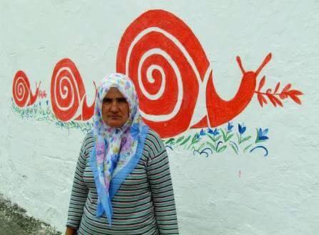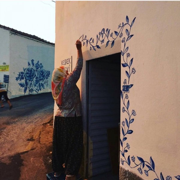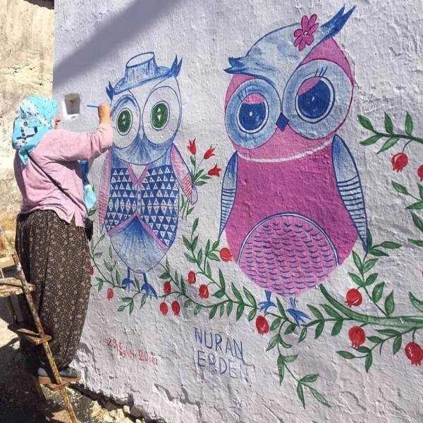 Nuran Erden isimli ablamız, köyde bulunan tüm bahçe ve ev duvarlarını boyayarak çeşitli desenlerle renklendirdi.